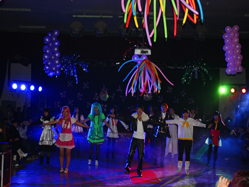首先,晚会在动感的摇滚演唱和精彩绝伦的Cosplay炫舞中拉开帷幕。可爱活泼的卡通人物走秀,轻盈如燕的民族舞蹈演绎,动感时尚的现代舞表演活跃了现场气氛,精彩的舞蹈赢得观众阵阵掌声。随后,各种热舞表演,典雅的晚礼服走秀再次引起与会观众共鸣。其中,学生会文艺中心男生集体编排的舞蹈将现场气氛引向高潮,夸张的肢体表演,搞笑的表情语言,整齐的舞蹈动作,极具创新的舞出了青春的张扬与活力。互动环节中,主持人与抽奖嘉宾的每一次喊号都引起观众阵阵尖叫。最后,在动感激扬的音乐节奏下,与会观众齐聚中央舞池,尽情领略圣诞狂欢的魅力。