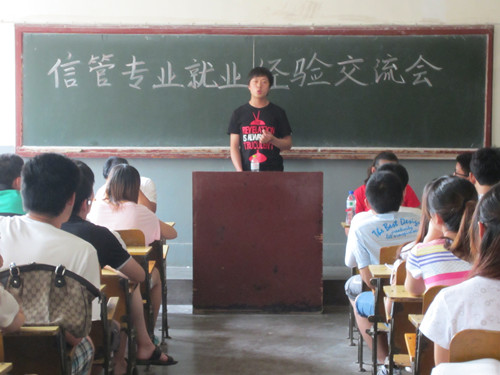 6月6日下午,商学院信管专业在1号教学楼103教室举行了就业经验交流会,会议邀请到了该专业08级朱秀功、刘钊、张配、安然、邱婕、李璐、战文7名签约成功学生。信管专业辅导员刘丽及该专业09级的全体学生参加了此次会议。