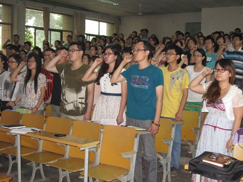 活动在雄壮的国际歌中开始,全院252名毕业生党员佩戴党徽,面向党旗庄严宣誓,重温入党誓词。随后,优秀毕业生党员代表宁远发言,他代表全体毕业生党员表达了对学校、学院悉心培养的感激以及积极配合老师做好各项毕业生工作的决心。随后,我院10届毕业生、我校优秀校友于宗福发言,他结合自身经验,全面、细致地与大家分享了毕业前学生工作的有效方法,倡导本届毕业生党员积极协助老师做好毕业生离校工作;并对即将奔赴工作岗位的毕业生提出两点建议,一是要保持年轻人的心态,谦虚好学,勤劳务实,任劳任怨,积极向上;二是要维护好母校的形象,“与母校共荣辱、与学院同奋进”。