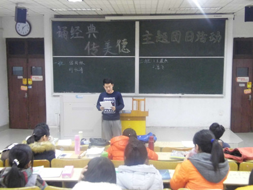 1220日,为响应近平总书记“培育和弘扬社会主义核心价值观,必须立足中华优秀传统文化”要求,大一各专业召开“诵经典,讲礼仪,传美德”主题班会并举办中华传统经典诗文朗诵比赛。