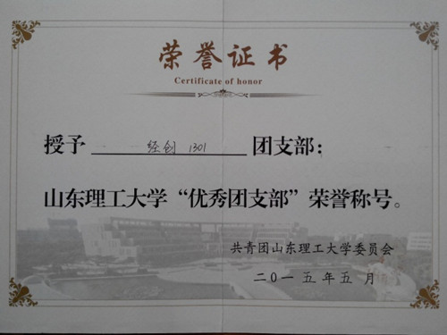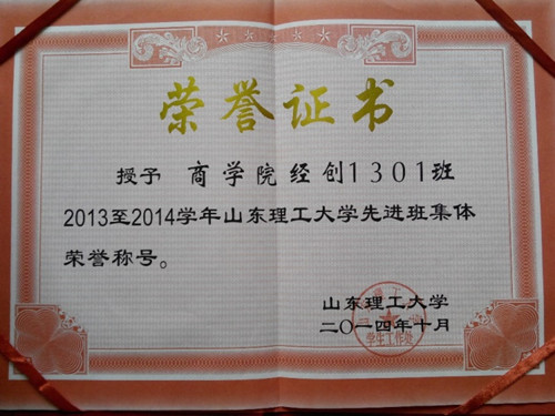 “勤学换来可喜成绩”。经创1301班自入学以来,被评为全国高校践行社会主义核心价值观示范团支部、校先进班集体(两次)、校红旗团支部、校优秀团支部、校特色团支部、校团支部风采大赛二等奖,成员共获得国家级奖项13项,省级奖励7项,校级奖项70项,院级奖项35项,累计证书达450余份,其中13人获校优秀学生奖学金,1人被评为院学习标兵,20人通过计算机二级考试,27人次通过从业资格考试。28人次在全国大学生英语竞赛、“认证杯”数学建模中国网络挑战赛、“大智慧”金融精英挑战赛、全国大学生网络商务创新应用大赛、齐鲁大学生创业计划大赛等国家、省级科创竞赛中获奖。班级所开设课程相对其他专业难度高,但班级挂科率低至5.41%,四级通过率为97.3%,六级通过率为90%。