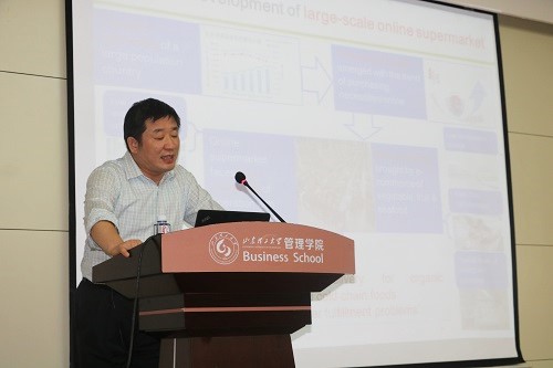 活动开始,程钧谟对胡祥培的到来表示欢迎,并对其经历进行了介绍。随后,胡祥培从过去所做的工作:在中国大城市提供有机蔬菜送货上门服务;正在做的事情:大型网上超市的多项目订单实现;将要做的工作:跨境电商和线上药房三方面,对新兴电子商务的物流管理进行了详细阐释。他讲到,我国电子商务的发展,既有电子商务销售额爆炸式增长、移动端成交额日益增加、实体零售业萎缩,人民生活方式转变等机遇,又面临着海量非结构化数据、网络信任及安全问题频发、物流配送难以保障等挑战。团队所做得工作就是要迎接机遇、应对挑战,改变企业产业结构,促使国家实现弯道超车。