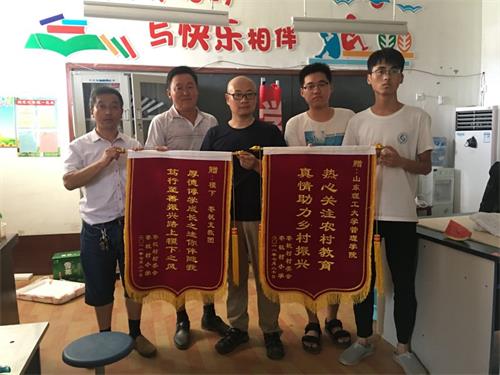 上午,枣杭村“第一书记”徐剑来到枣杭小学看望支教团,并分别赠予我校管理学院与“稷下·枣杭”支教团队一面锦旗,前者的锦旗内容是“热心关注农村教育,真情助力乡村振兴”,后者的锦旗内容是“厚德博学成长之途你伴随我,笃行至善振兴路上稷下之风”。他强调,近期天气炎热,支教团成员要注意防暑防晒,注意饮食安全,身体是革命的本钱,要以最昂扬的精神风貌面对接下来的支教活动。