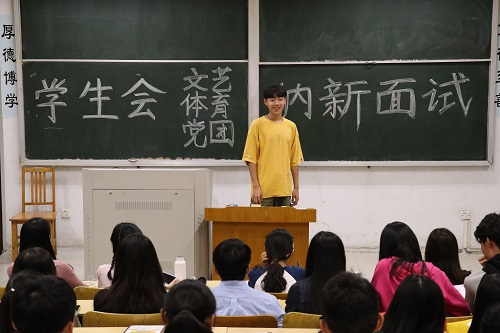 面试开始前,同学们在大阶梯教室候场,由现场相关工作人员按面试顺序将其引导至正式面试地点的小教室。在候场室中,同学们有条不紊地准备各自的演讲,等待面试的到来。面试,同学们要根据自身情况做2-3分钟的自我介绍并描述自己对所填报志愿部门的工作思路。随后,评委们将根据竞选人的内容提出例如“对填报志愿部门的工作有什么看法?”、“当工作影响学习时会如何选择?”、“为什么要加入这个部门?”等问题,面试者沉着冷静地做出回答。