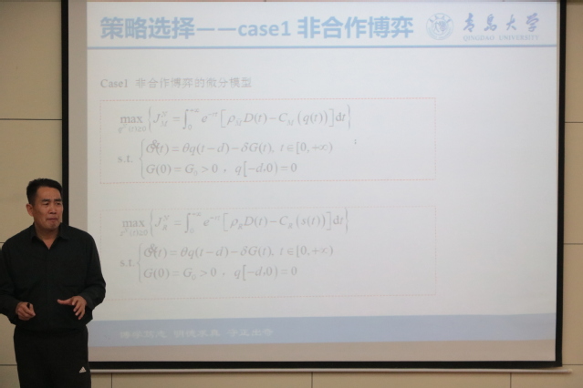 胡劲松教授从延迟效应及描述、策略选择、博弈结构选择三个方面展开他的报告。首先,他表示可以经过研究分析,计算出函数表达式,清晰明了地刻画出延迟效应,让同学们快速捕捉到信息。质量改进和产品销售都存在延迟效应,此次研究就是针对“如何解决延迟效应”问题,做出的应对措施。其次,他指出,策略选择有非合作博弈、合作博弈、制造商销售参与率分析以及零售商生产参与率四种情况,并且对博弈结构的选择有了两个清晰的认识:制造商分担好于非合作、制造商和零售商也乐于进行制造商分担。最后,胡劲松结合自身学习生活经验,给同学们提出一些建议,他希望同学们要善于关注行业问题,从中提炼出最有价值的观点,并不断进行补充。