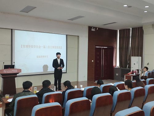 3月12日下午,管理学院在东校区四号教学楼报告厅开展院学生会一届二任主席团换届工作,此次活动由学院团总书记巩丽、部分学生科辅导员及部分现任主席团成员担任评委,主席团候选人参加此次答辩。