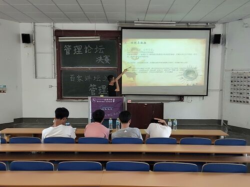 初赛结束之后,管坛活动负责人公布决赛答辩顺序,以方便参赛者提前做好准备。答辩开始前,管坛成员做好贴条幅、写黑板字等准备工作,并提醒参赛者将本小组的PPT拷到电脑上。答辩过程中,参赛成员以任正非、宗庆后等优秀企业家、管理者为例,通过展示PPT、播放视频等方式向大家分析管理者在企业成长过程中采取的管理措施,以及本企业独特的管理模式。且各小组演讲者多角度剖析优秀企业家及其管理经验,诠释不同管理者在克服困难中采用不同方式,和由此产生的不同企业文化、企业家精神。进行答辩的同学在台上从容淡定、吐字清晰,有条不紊地介绍自己的观点、看法。在每组答辩结束后,评委们根据小组PPT展示的内容进行提问,答辩者有针对性地进行解答,阐明自己的观点。同时,在答辩过程中,场下观众注意听取不同答辩者的观点和不同管理者的管理方法,认真思考评委提出的问题,并从中学习管理知识。最后,赵霏宣布活动结束,各位参赛者有序离开。