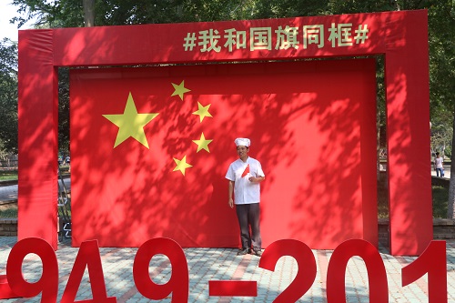 晨练的退休老人们在国旗下分享着自己与祖国的风雨历程,讲述着祖国七十年沧桑巨变,“如今我已花甲,祖国却正青春。”真切的话语回响在同学们耳畔,激励吾辈当自强。食堂阿姨在一早的忙碌后也来到活动现场,爽朗的笑声回荡在中心花园上空。门卫安保人员、快递员、外卖小哥、环卫工人……各行各业的工作人员在听闻活动后也都赶来与国旗合影。各大社交平台、朋友圈迅速被“我和国旗同框”刷屏,不少同学表示到,这是庆祝祖国母亲生日最特别、最直接、最有意义的方式。