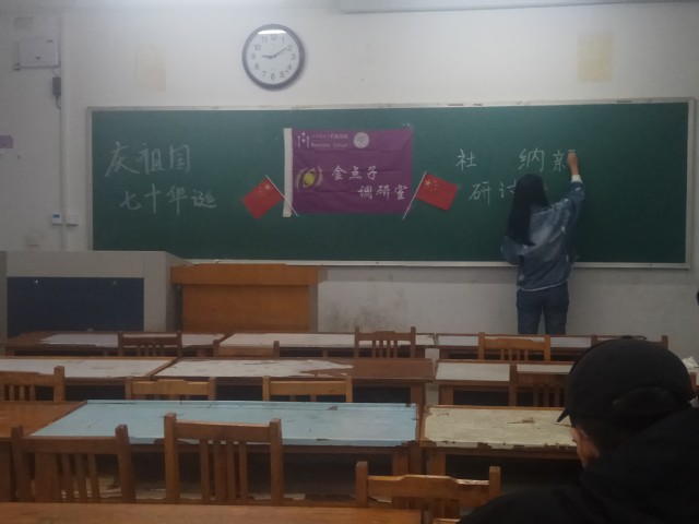 10月17日晚九点,金点子调研室于东校区三号教学楼204教室举办金点子调研室社团“庆祖国七十周年华诞”,及金点子调研室“纳新研讨会”。本次会议由金点子调研室会长黄小纯主持,主要通告并布置社团的将要承办的“百团大战”活动的安排,各部部长均参加。