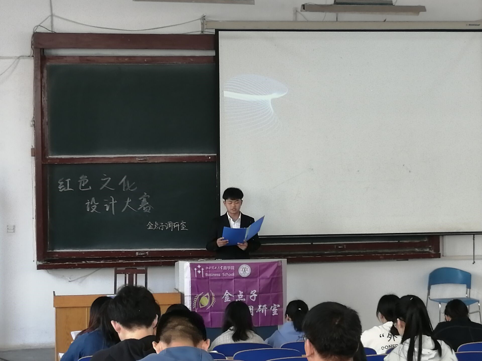 111日下午,金点子调研室举办的红色文化设计大赛答辩于四号教学楼103教室举行。此次比赛由金点子调研室会长黄小纯组织策划,社团会员部、策划部、新闻部、秘书处等部门联合组织,副会长秦琰霜、部长陶素格,社团优秀成员李广通、余邦正、张越担任评委。张康豪主持,共有10支队伍参加此次比赛。