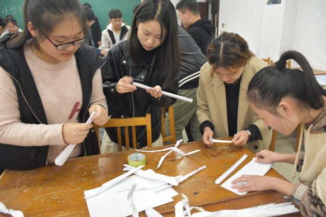 此次比赛分为财会小常识激情点钞智慧搭桥三个关卡。第一关财会小常识的题目以基础财会知识为主,帮助同学们在活动中更好的了解会计知识,同学们在考场上安静有序地进行试卷答题。第二关是激情点钞,每个小组可派出一到两名成员进行比赛,在该环节中学生们清点钞票数量,计算钞票总额,考验学生的点钞速度和计算能力,在实践中强化会计基本能力。第三关智慧搭桥,此环节考验团队的集体智慧,小组成员通力合作用纸张、胶带等简易的道具,制作出最好的桥梁,通过在桥梁上放置书本的数量反应桥梁的承受能力。