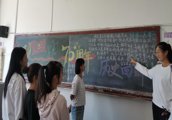 班委全体成员组织班级开展主题板报活动,用粉笔一笔一划诉说祖国七十年的辉煌历史,用文字让同学们感受祖国七十年的风风雨雨,让同学们珍惜来之不易的当下幸福生活,激发胸中激情,鼓励同学们以实际行动提高自己,服务社会,为祖国的发展贡献的力量,组织学生参观讲解。我们这次活动并非空喊口号,相反通过板报的形式让同学们感受建国七十周年中老一辈对祖国的无私奉献,让同学们在今后的日子里努力学习专业知识,用我们自身去推动祖国的富强之路。祖国用了七十年的时间为我们铸就了一个如此繁荣富强的国家,我们也有责任以自己的付出去回报祖国。