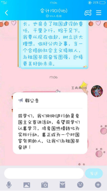 9月19日下午会计1901团支部在QQ群开展“我与祖国共奋进”大讨论。此次爱国主义宣讲活动围绕主题,旨在通过大讨论的形式,与同学们共同学习与回顾新中国成立七十周年以来走过的光辉路程让同学们结合自身,探讨如何为中国梦的实现贡献自己的力量,激发出同学们心中的自豪感,荣誉感,责任感。