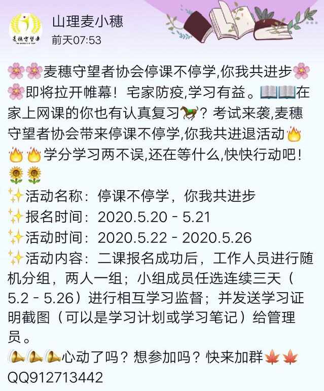 宅家防疫,学习有益。为提高大学生的学习自制力,培养学生积极向上、热爱学习的心态,太阳成集团tyc122cc入口麦穗守望者协会于5月18日至5月20日以线上宣传的形式举办“停课不停学,你我共进步”的宣传活动。