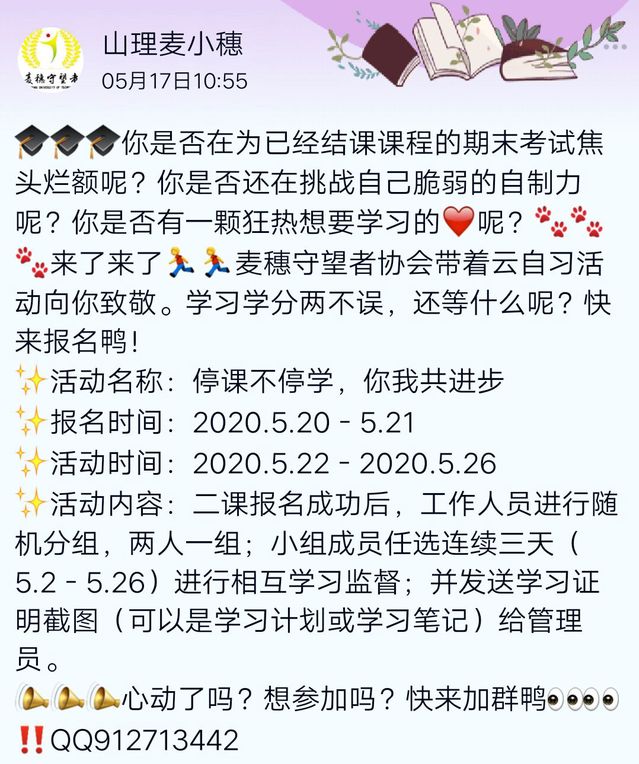 为确保此次活动的进行,麦穗守望者协会宣传人员进行积极的线上宣传工作。麦穗守望者协会通过各种社交平台及时进行推广,使大家了解活动的基本概念、目的和意义,希望大家在了解活动后积极报名,参与到此次活动中。二课报名成功后,工作人员进行随机分组,两人一组。此次活动要求小组成员在5月22日至5月26日期间,任选连续三天进行相互监督学习,将学习计划或学习笔记等学习证明在活动结束后需发送给管理员。