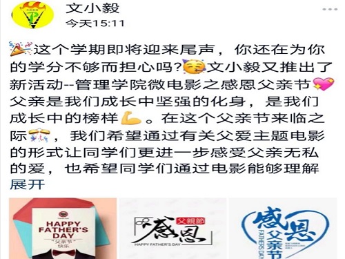 活动开始前,文毅家园的人员进行为期三天的宣传工作,利用各种渠道大力进行宣传,鼓励同学们积极参加此次活动。同时工作人员创建此次活动的QQ群,便于同学们更加了解此次活动的流程和相关内容。此次活动,文毅家园的相关负责人提供多部可歌可泣的有关伟大父爱的电影:《摔跤吧爸爸》、《我的爸爸是国王》、《告别》、《父女情》、《如父如子》、《美丽人生》等。此次活动要求同学任选其中一部电影自行观看,写下感悟,表达自己对父亲的感恩之情,发送到指定邮箱,相关负责人员进行统计。