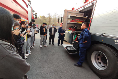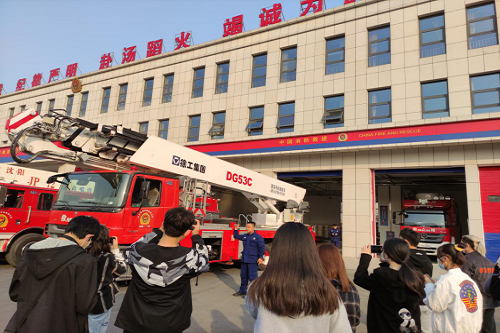 到达消防大队后,大家受到消防工作人员热情接待,消防工作人员先后为我们讲解泵浦消防车、水罐消防车、泡沫消防车、高倍泡沫消防车、干粉消防车、登高平台消防车、云梯消防车和供水消防车的特性及用途。另外,消防工作人员还和我们分享一些出警时的小故事。
