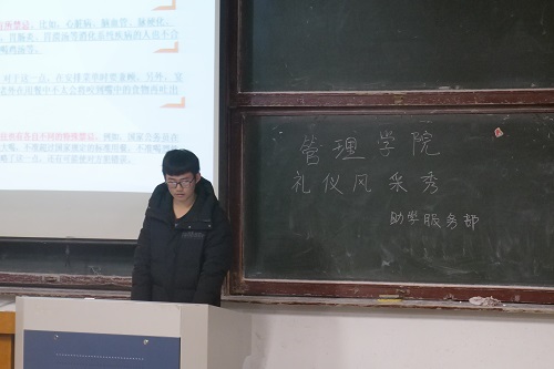 11月28日下午,管理学院于1号教学楼举办“礼仪风采秀”比赛,此次比赛由管理学院学生会助学服务部举办,助学服务部副部长崔俊杰主讲、史长帅主持,部分学生参加。