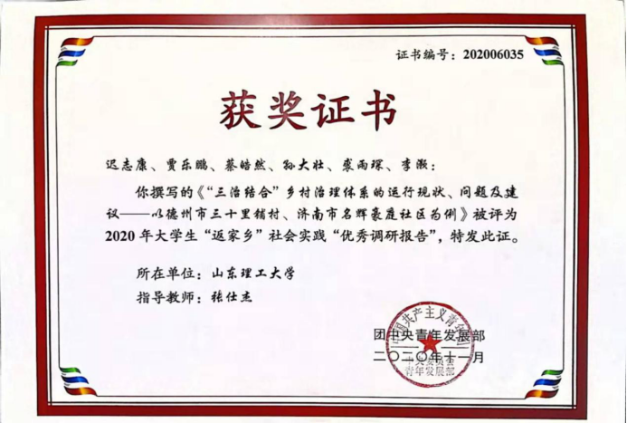 改革开放以来,随着我国城乡政策的日益推进,城乡关系呈现显著变化,总体呈现出由城乡分割到逐步融合的趋势,城乡经济联系趋于密切。为积极响应国家政策,管理学院的社会实践小组就针对德州市和济南市地区的相关治理问题开展了社会调研,并取得优异的成绩。他们撰写的《“三治结合”乡村治理体系的运行现状、问题及建议——以德州市三十里铺村、济南市名辉豪庭社区为例》被评为2020年大学生“返家乡”社会实践“优秀调研报告”。