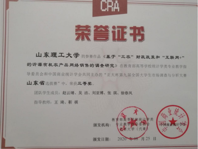 近日,历经几个月的“正大杯”第九届全国大学生市场调查与分析大赛山东省选拔赛落下帷幕,来自我校管理学院的五位优秀学生成功晋级总决赛。并且取得三等奖的优异成绩。