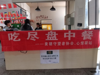 为使师生深入了解、关注学雷锋”与志愿活动,心晴驿站与麦穗守望者从光盘行动处入手,呼吁大家珍惜粮食,节约粮食。节约是一种美德,是每一位大学生道德品质的体现,更是每一位大学生的责任和义务。4月16日至4月20日心晴驿站与麦穗守望者协会于东校区金园餐厅举办本期“吃尽盘中餐活动。此次活动由心晴驿站与麦穗守望者协会合办。