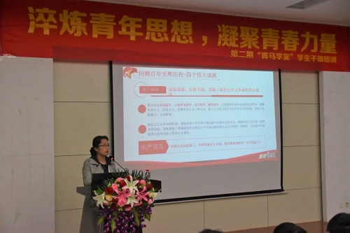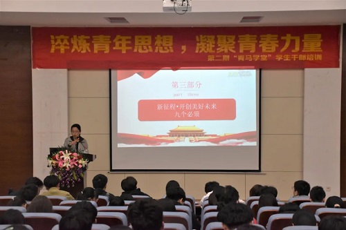 10月28日晚,管理学院在4号教学楼报告厅举行第二期“青马学堂”学生干部培训,此次培训由管理学院团总支书记巩丽以“学习习近平总书记在中国共产党成立100周年大会上的重要讲话精神”为主题为全体青马学堂学员上团课。