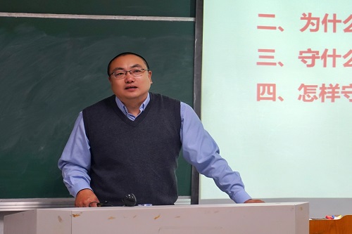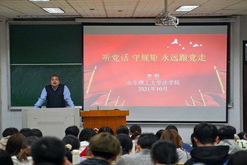 随后,李哲从“中国共产党是一个什么样的政党”“为什么要守党规党纪”“守什么样的党规党纪”与“怎么守党规党纪”四个方面向学生阐述了“听党话,守规矩,永远跟党走”的原因与做法,强调了中国共产党的重要性以及对人民、社会与国家的意义。他以排雷英雄杜富国为例向学生展示了中国共产党的坚守初心、守正创新的精神。