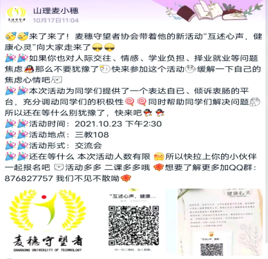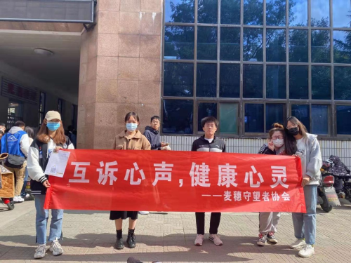 为增强大学生在校园生活中与同学、老师的相互交流、沟通的能力,培养打开心扉与人相处的习惯,树立积极乐观的人生态度和为人处世的三观意识。麦穗守望者协会于2020年10月21日至10月22日进行“互述心声,健康心灵”的宣传活动 。此次活动旨在增进同学们间的交流。为同学们搭建一个表达自己,倾诉衷肠的平台,同时帮助同学们解决问题,让同学们拥有更好的大学生活。