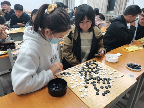 王艺儒讲解完毕后,让社团成员两两自由组队,练习今日上课所讲内容,提高吃子技巧运用的熟练程度,其间王艺儒还对学员的棋局耐心指点和讲解,进一步加深同学们对围棋的了解。