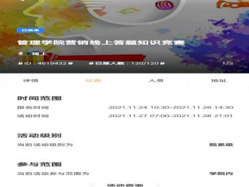 为增强同学们对营销学的认识,实战营销社团于2021年11月27日8:00—20:00举行易班线上营销知识答题比赛。本次大赛的主要负责人是实战营销协会会长代丛丛,主办单位是实战营销协会。