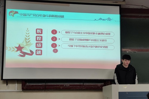 接着,李劲松同学向全体人员讲述了中国共产党百年奋斗的辉煌成就:在这百年征程中,我们取得了马克思主义中国化的丰硕理论成果;锻造了日臻成熟的马克思主义政党;引领了中华民族伟大复兴的历史进程;高扬了科学社会主义的伟大旗帜。回眸昨日,祖国的成就辉煌,展望明天,我们的豪情满怀,新的世界,是祖国青年人的世界,我们要勇敢地承担起祖国的重托,我们要跨越新的一代,把自己的人生理想与祖国梦想,与时代发展紧紧联系在一起,做个新时代的社会主义事业的建设者和接班人。