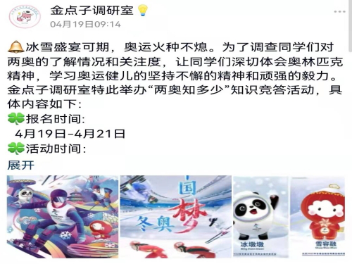 4月15日,管理学院金点子调研室社团经商讨后决定开展“两奥知多少”知识竞答比赛。活动时间持续一周,于4月22日和4月23日两天进行比赛,活动采取线上答题的方式记分,共有来自管理学院的200余名学生参此次比赛