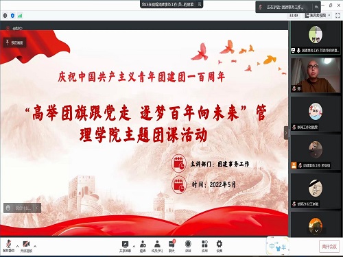 5月4日晚,管理学院在线上开展“高举团旗跟党走,逐梦百年向未来”主题团课,此次主题团课分为团课和团日活动培训两部分,由学院学生科辅导员郑坤主持,团委书记李璐、学生会团建事务工作工作人员苏波萍主讲,20、21级各团支部代表参加。