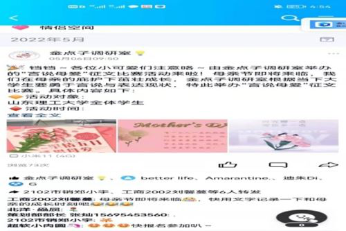 5月8日,母亲节来临之际,金点子调研室社团组织开展以“言说母爱”为主题的征文比赛活动,管理学院部分学生踊跃报名,积极参与。