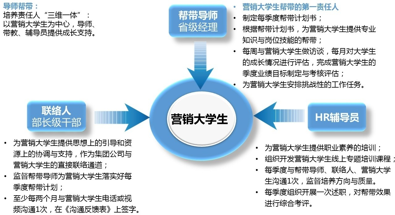 根据公司能者上、庸者下、平者让,不论资排辈,给年轻人机会的用人理念,营销将才作为全国销售市场星级省级经理储备军,由集团、销售公司、市场“三方培养、定期跟踪”,省级市场总经理负责帮带,销售公司总经理、人力资源部部长等集团高管长期联络与关注!目标是3年时间培养成为优秀区域经理,5年后成长为新星省级经理!