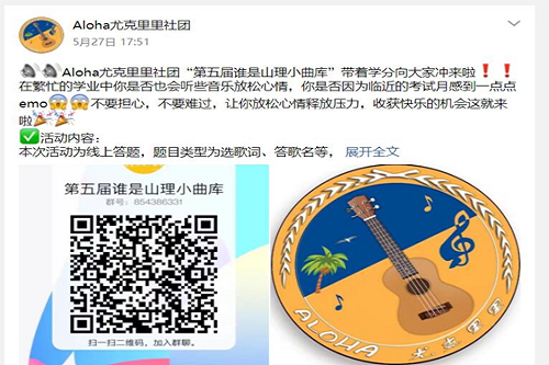 为丰富校园文化生活,展现我校大学生积极向上的精神面貌,倡导健康高雅的文化活动,推动音乐艺术在校园发展的同时,为同学们提供一个分享歌曲的平台,Aloha尤克里里社团于5月31日以线上答题的形式举办此次“谁是山理小曲库”易班答题活动。
