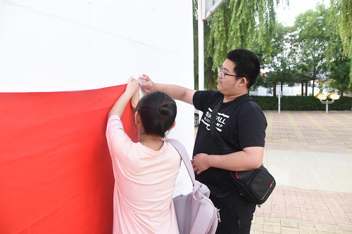 摄影活动准备阶段,调研团成员根据场地光线选取最佳拍摄角度及位置,拍摄事宜确定完毕后,张贴红色背景板,放置板凳。