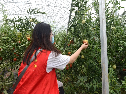 实践团成员在工作人员的指导下进入西红柿种植大棚,切身参与农业生产活动,农户为实践团成员详细介绍西红柿的种植过程和现阶段生长状况,实践团成员积极参与大棚施肥与除草。同时,当地农户向实践团展示大棚内部智能灌溉系统、喷洒农药装置以及智能测温控制棚内通风系统。在劳动过程中实践团成员体会到了农业生产的不易和发展科技助农的重要性。