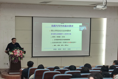 会议伊始,倪教授首先介绍了论文选题与写作的基本要求。他指出认真理解个人培养方案是进行硕士论文写作的基础,除了要体现一定的创新意识以外,更要精准、具体,可比性是具体的最好阐述。同时,还要做到可定量化,前后能够进行对比,学术硕士要注重文献结果的对比,专业硕士要注重实践效果的对比。相对应的,学术硕士的选题应源于文献的学术价值,而专业硕士的选题应源于实践的应用价值。