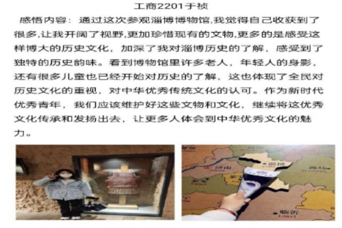 紧接着,志愿者们走进博物馆参观,可以看到淄博市博物馆内物品陈列整齐,琳琅满目,令人目不暇接。秦、汉、唐、宋等朝代仿佛从未消亡,一直留存在这一个小小的博物馆中,战国白玉透雕双龙纹环、唐代黑釉四出碗、明代青玉寿星等无一不体现着这座城市的历史底蕴之深厚。