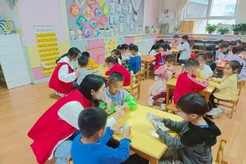 活动开始前,志愿者们在山理工小博士幼儿园门口汇合,进行拍照合影,随即志愿者们分成三组,分别进入三个班级。