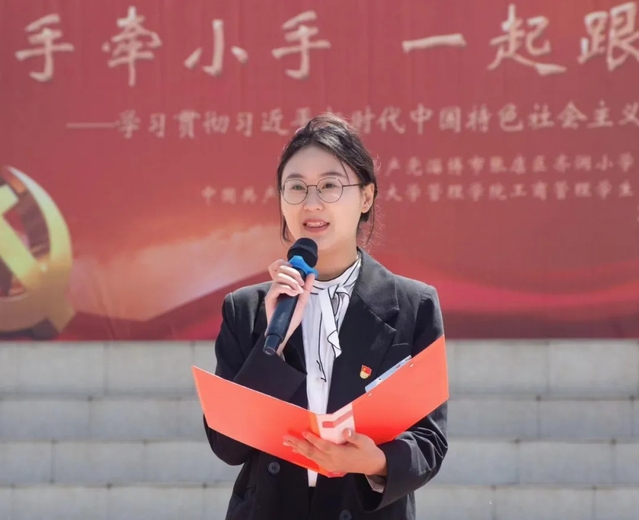 接着,管理学院工商管理学生党支部党员代表、校十佳大学生王洁作国旗下主题微党课。她分享了自己在党组织引领下的成长历程。她叮嘱少先队员们,要铭记党的光辉历程,让红色基因代代相传,坚定不移地在探索中国特色社会主义道路上奋勇前行。号召全体队员们无论身处何地,都要将“入队、入团、入党”作为青年追求政治进步的“人生三部曲”,坚定信仰、磨砺品质、锻造意志,为实现中华民族伟大复兴的中国梦贡献力量!