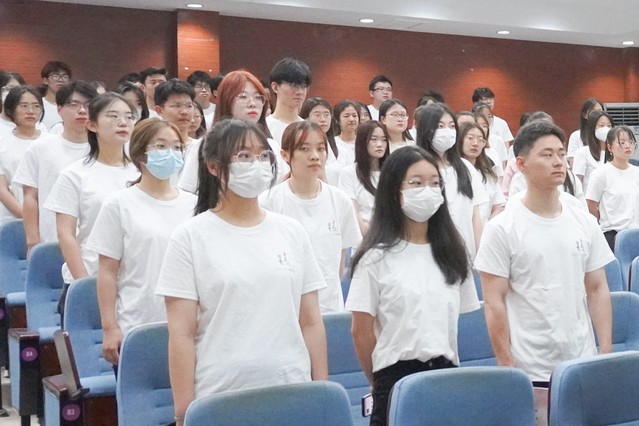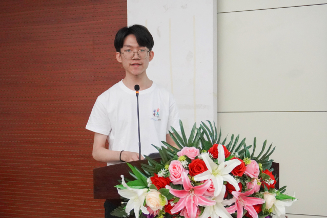 第五期“青马学堂”学员代表解少炫发言。他代表全体学员郑重承诺:将仰望星空,坚定信念;脚踏实地,练好本领;敢于吃苦,服务师生;肯于奋斗,争当先锋。