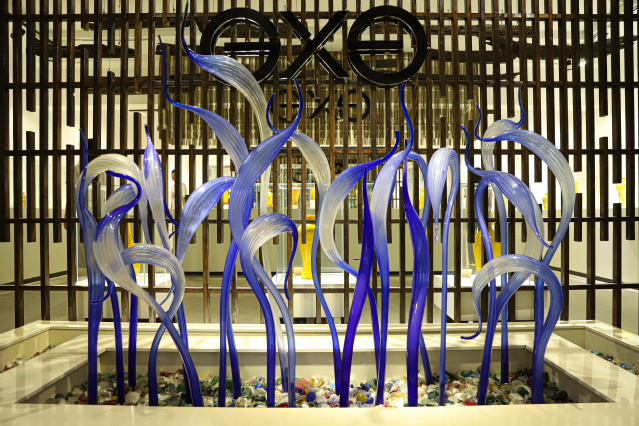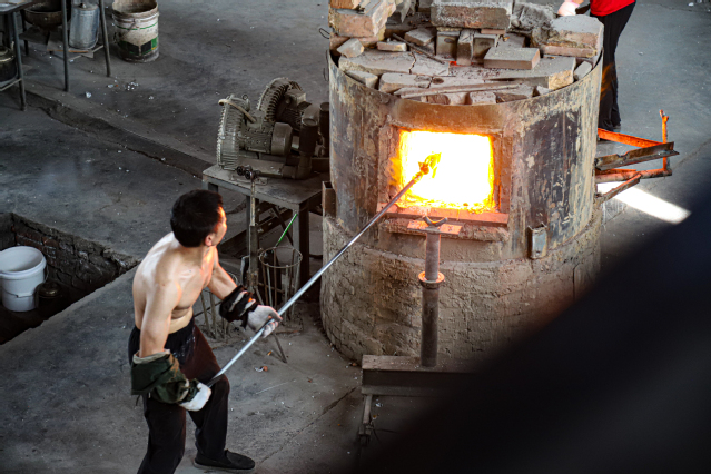 随后,团队成员前往二楼观景连廊,现场观摩金祥琉璃生产车间,零距离全景式观赏琉璃的研发设计和生产制作过程。琉璃工匠们顶着高温,将水晶琉璃母石在1400多度的窑炉中熔化后,经过化料、挑料、吹制、塑型等十多道手工工艺,烧制出五光十色、天工自拙的琉璃。团队成员们在感受琉璃制作古法工艺的同时,品味浴火淬就的不朽艺术,感受琉璃技艺亘古不息的造物文脉传承发展。