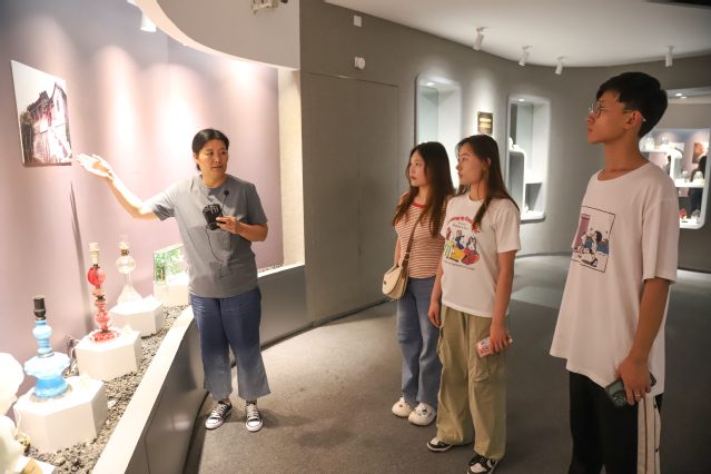金祥琉璃文化艺术有限公司是一家集琉璃研发、制作、展示和营销于一身的专业化文创企业。团队成员在工作人员的带领下,先行参观了金祥琉璃博物馆。团队成员近距离观看精美的琉璃展品,在工作人员的讲解下了解其文化艺术价值和历史科学价值。从普普通通的鸟兽鱼虫、瓜果花香等日常摆件,到独具匠心的抽象艺术,再到以假乱真的仿玉精品……无不折射着琉璃工匠的创新之路、智慧之举和时尚之心。博物馆全方位展示博山金祥琉璃传统文化、现代琉璃艺术和色彩美学,具有浓郁的地域文化特色,带给团队成员们文化的熏陶、美的享受和智慧的启迪。