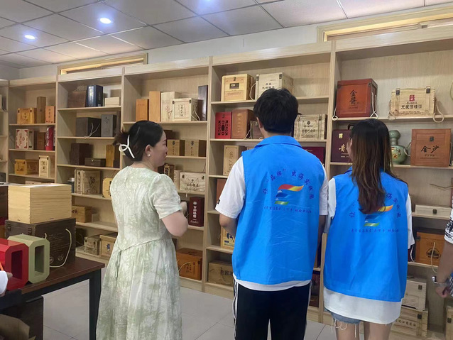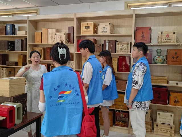 实践团成员先是在谷瑾瑾总经理的带领下在百泽木艺品二楼展厅进行参观,展厅里摆放着各式各样的酒盒和茶盒,经过与谷总的深度交流,实践团了解到这些产品的制作采用的是“企业+电商+农户”的运作模式,公司接到订单后,先是了解客户需求,根据客户需求购买材料,再由农户拉到家里进行组装,组装完成后再拉到厂里进行喷漆、印刷、质检等工作,这一模式的运用充分带动了当地居民的就业,为企业带动乡村振兴赋能。