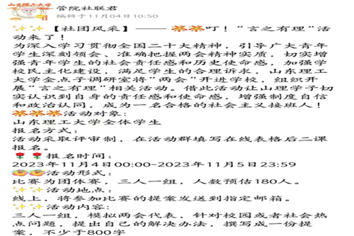 此次活动由金点子调研室于线上举办,报名时间为2023年11月4日至2023年11月5日,活动时间为2023年11月6日至2023年11月12日。 在此次活动的过程当中,大家积极踊跃的进行投稿,在模拟中展现出了自己对社会上热点问题的解析,分享自己的看法。而在活动结束后,本社团也对提交的每一份照片都进行了严格的审查,杜绝弄虚作假行为。