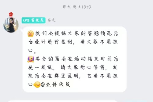 最后社团成员会根据大家的答题情况在后台统计进行签到,并且在后台统计后进行统一发放二课学分此次打卡活动,同学们积极参加,认真学习乐理知识,不仅在群里接受社团成员的乐理知识传授,也积极在群里和社团成员一起探讨音乐的奥秘。