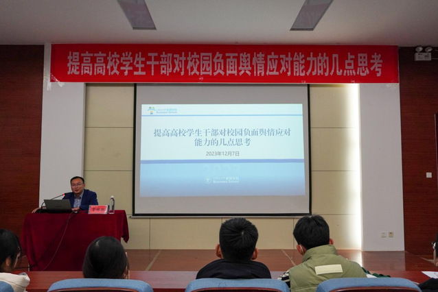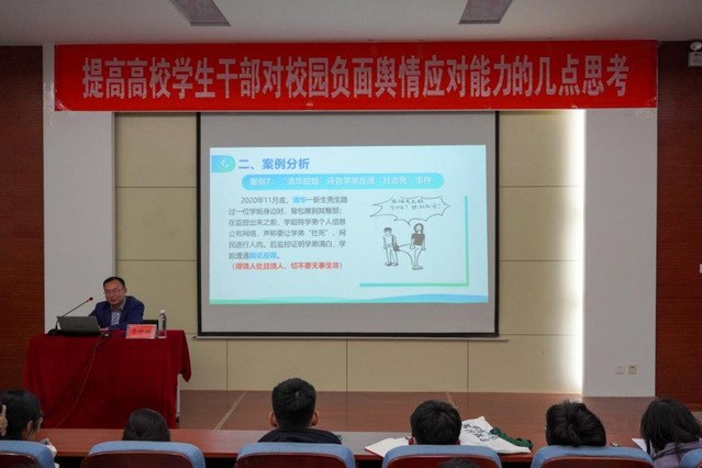 最后,曹林林给与会学员提出两点建议。一是要拥有处理负面舆情的正确态度,提高舆情应对效率,深入了解情况、正确考量、以感同理。二是作为学生干部应增强自身应对舆情的能力,同时引导全体同学遵规守纪、文明上网、健康上网。