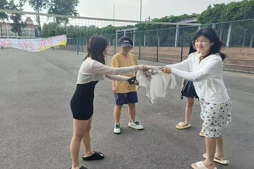 场上气氛紧张而热烈,同学们纷纷化身为勇敢的战士,为了守护自己的“国王”而展开激烈的对决。海绵枕头在空中飞舞,同学们灵活地躲避、巧妙地传球,每一次成功的防守和进攻都引来观众的阵阵喝彩。这个游戏不仅锻炼了同学们的反应能力和团队协作精神,更在无形中加深了同学之间的友谊。紧接着是“传递衣服”环节。在这个环节中,同学们需要紧密配合,将一件宽松的衣服从队伍的第一人传递到最后一人。看似简单的任务,在实际操作中却需要极高的默契和协调性。同学们纷纷调整姿势、寻找最佳传递方式,在紧张刺激的游戏中感受到了团队的力量和乐趣。